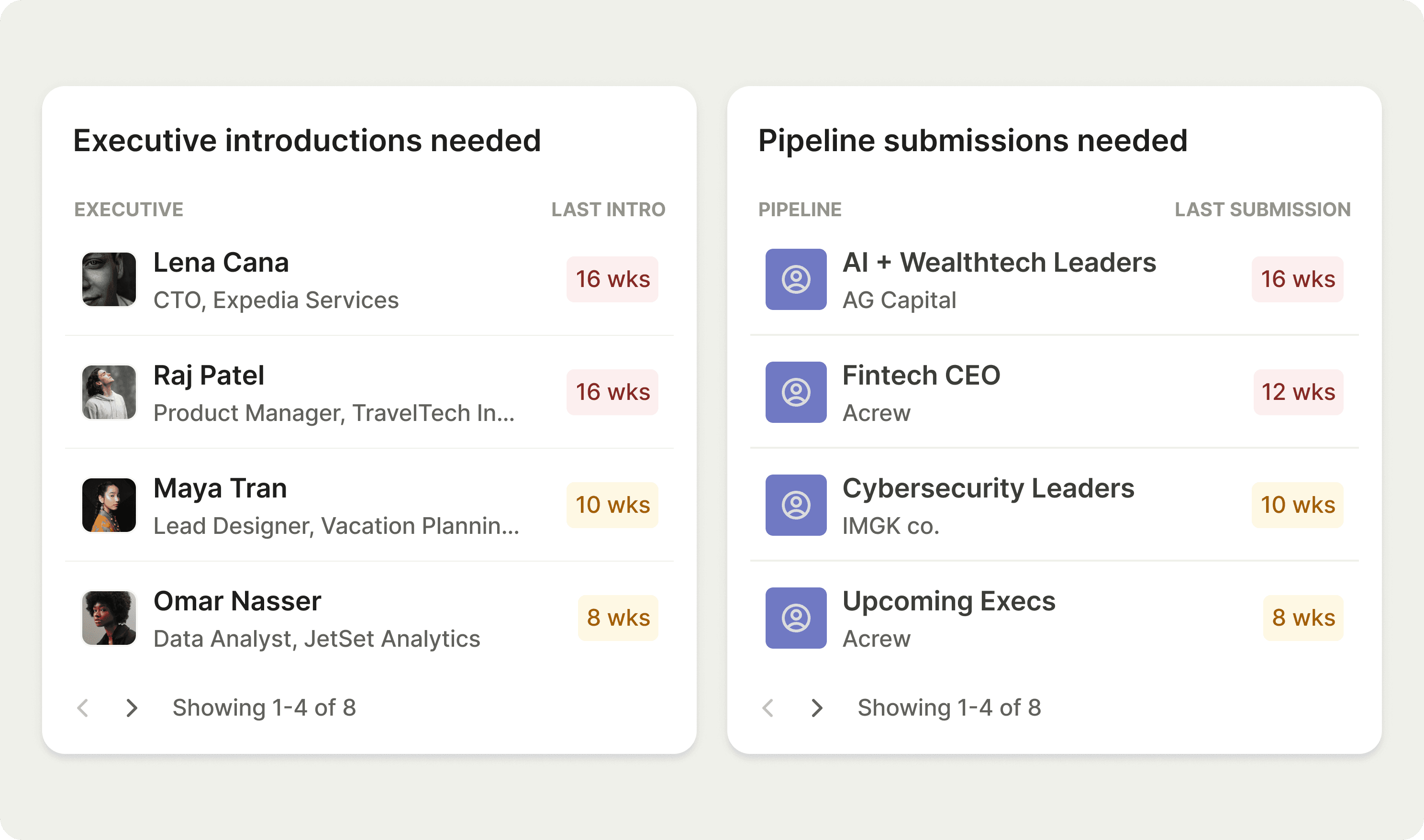On the enterprise side of the business, we needed to also raise awareness into executive searches that required additional executive submissions. Highlighting both executive introductions needed and search submissions needed helped improve tracking for each of the respective teams and also increased visibility into the complementary needs of the other team. This was helpful because the enterprise team can see which executives need attention - if they happen to fit the bill for existing searches then we are able to fulfill double needs.
